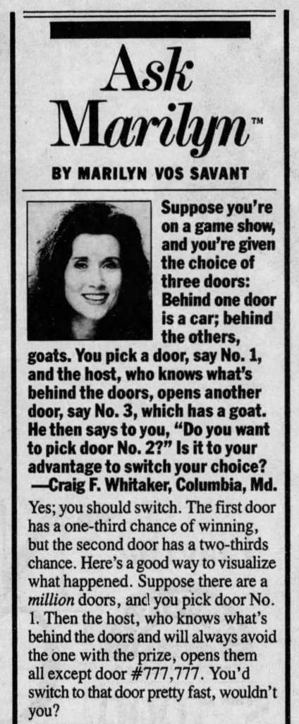 The ‘Monty’ from the problem is based on the TV host Monty Hall, who was the host for the game show, Let’s Make a Deal. He never did offer the player to switch the door. This formulation was from vos Savant’s reader. A version of this problem was originally posted by Martin Gardner, Three Prisoners Problem.
