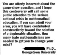 “You are utterly incorrect about the game-show question, and I hope this controversy will bring some public attention to the serious national crisis in mathematical education. If you can admit your error, you will have contributed constructively toward the solution of a deplorable situation. How many irate mathematicians are needed to get you to change your mind?”