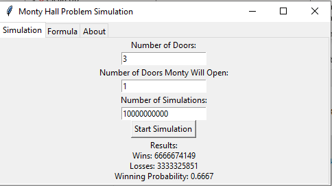 I have created a simulator program that the reader is welcome to play around with. This is an executable file and was coded in Python. Please do verify that there is no virus. I ran 10 billion simulations, and the end result was that the player won 0.6667 times when they switched. This aligns with the theoretical probability.